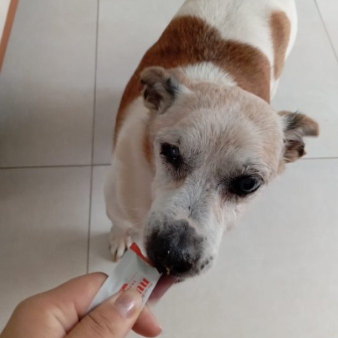 O Toby, com seus 21 anos, é super seletivo quando se trata de petiscos, mas ele simplesmente adorou o snack cremoso do Bem-me-Pet! Agora, não pode faltar um por perto para deixar o dia dele ainda melhor.